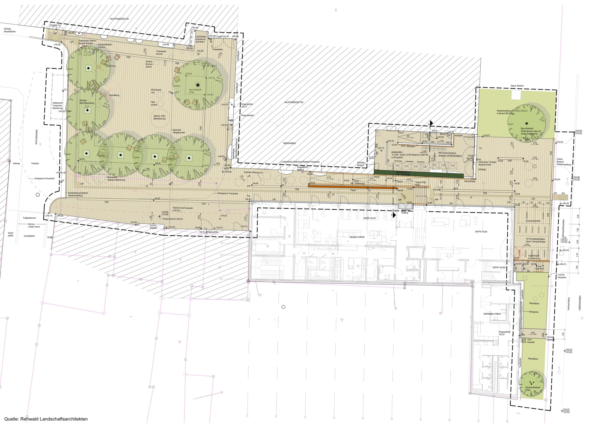 Das Projekt gliedert sich in zwei Hauptbereiche: die Sanierung des denkmalgeschützten Hörsaalanbaus am ehemaligen Griesbachschen Haus sowie den Neubau eines modernen Gebäudeteils. Der Sanierungsbereich umfasst die Aktivierung und Integration der Innenräume des historischen Auditoriums, um dessen historische Bedeutung zu wahren und sinnvoll zu nutzen. Der Neubau soll zwischen dem denkmalgeschützten Hauptgebäude der Universität am Fürstengraben und dem ebenfalls denkmalgeschützten Hörsaalanbau eingeordnet werden. Zudem werden der Torbogen des Hauptgebäudes und die Grundmauern des zerstörten Griesbachschen Hauses in das Bebauungskonzept integriert.